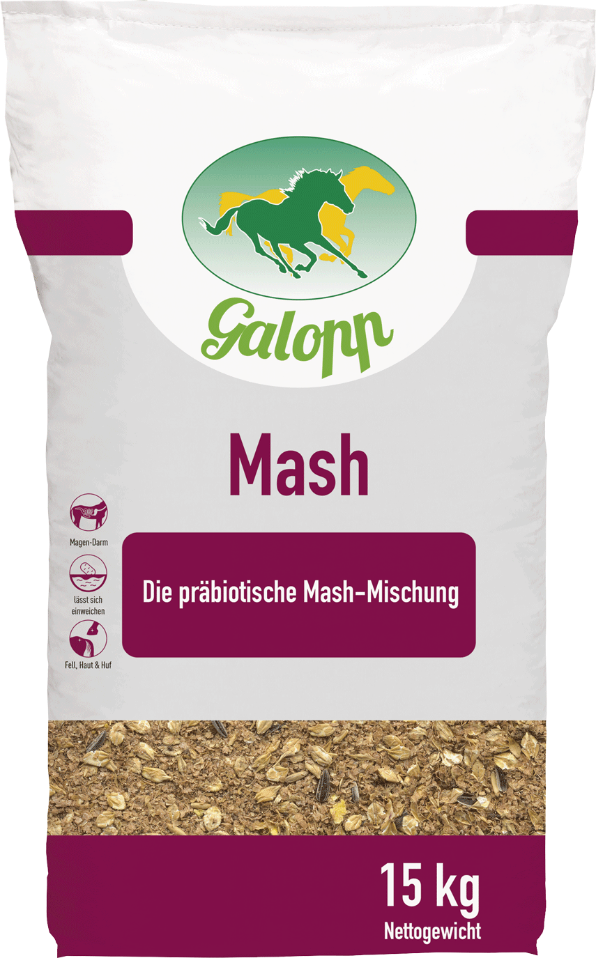 Galopp Mash 1 – 2 mal pro Woche einsetzen. Es ist stets frisch zuzubereiten und zu verfüttern.